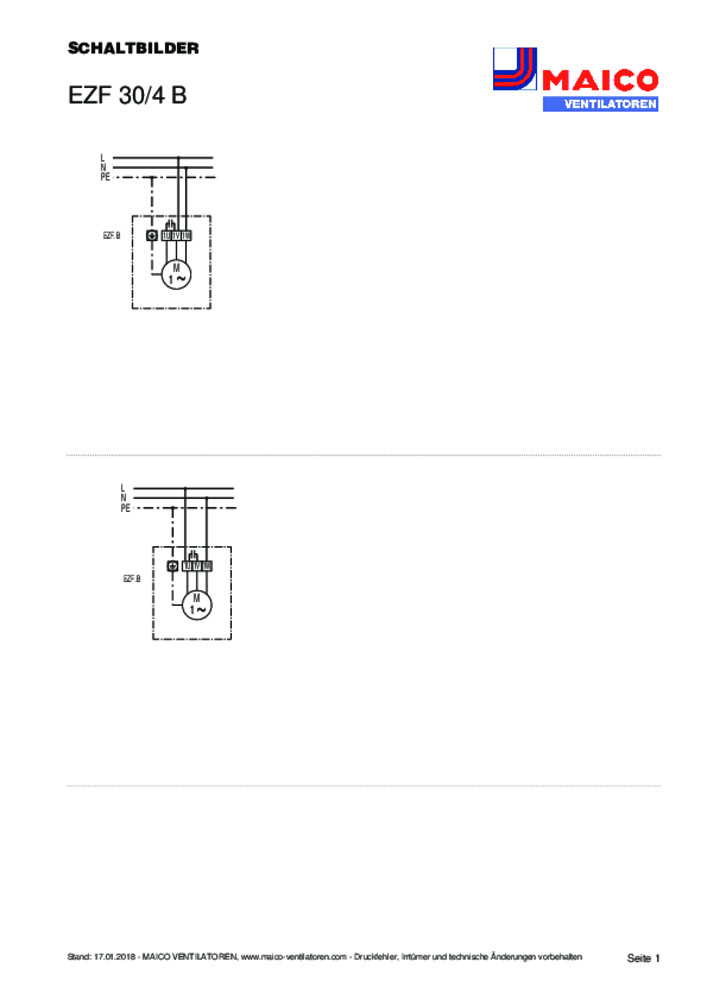 Zur Unterputzmontage. Einbau in jeder Lage möglich. Wandhülse aus verzinktem Stahlblech. 8-blättrige Flügelräder aus glasfaserverstärktem Polyamid. Dynamisch gewuchtet in 2 Ebenen, gemäß Gütestufe 6.3, DIN ISO 1940, Teil 1. Kunststoff-Schutzgitter auf der Saugseite, perlweiss, Berührungsschutz gemäß DIN EN ISO 13857. Förderrichtung: Nachfolgende Abbildung zeigt die Förderrichtung. Förderrichtung A: Über den Motor saugend, Standard, Förderrichtung B: Über den Motor blasend, auf Anfrage erhältlich, Drehrichtung, Reversierbetrieb: Der Volumenstrom verringert sich um ca. 35% bei anomaler Förderrichtung. Motor: Asynchronmotor. Reversierbar. Ausnahme: Ventilatoren mit Spaltpolmotor (...-E). Nicht zur Förderung wasserdampfgesättigter Luft geeignet. Wechselstrommotor: Typenreihe EZF. Bemessungsspannung 230 V, 50 Hz. Thermischer Überlastungsschutz serienmäßig. Ventilatoren ../B: Kondensatormotoren mit Betriebskondensator am Schutzgitter oder an der Wandhülse. Schutzart IP 55. Ventilatoren ../D: Kondensatormotoren mit Betriebskondensator im Anschlusskasten. Schutzart IP 54. Ventilatoren ../E: Spaltpolmotoren, nicht reversierbar. Schutzart IP 54. Elektrischer Anschluss: An Klemmleiste im Abschlussdeckel des Motors. Sicherheitshinweise: Bei freier Ansaugung darf der Ventilator nur in Betrieb genommen werden, wenn der Berührungsschutz des Laufrades gemäß DIN EN ISO 13857 gewährleistet ist.Artikel: EZF 30/4 B, Ausführung: Wandhülse, Fördervolumen: 1700 m3/h, Drehzahl: 1425 1/min, Laufradtyp: axial, Drehzahlsteuerbar: ja, Reversierbarkeit: ja, Spannungsart: Wechselstrom, Bemessungsspannung: 230 V, Netzfrequenz: 50 Hz, Nennleistung: 90 W, Leistungsaufnahme: 110 W, INenn: 0,4 A, IMax: 0,5 A, Schutzart: IP 55, Wärmeklasse: B, Netzzuleitung: 3 / 1,5 mm2, Einbauort: Wand / Decke, Einbauart: Unterputz, Einbaulage: waagerecht / senkrecht, Material: Stahlblech, verzinkt, Gewicht: 6,6 kg, Nennweite: 300 mm, Breite: 365 mm, Höhe: 365 mm, Tiefe: 300 mm, A: 365 mm, B: 319 mm, Fördermitteltemperatur bei Nennstrom: 60 °C, Fördermitteltemperatur bei IMax: -20 °C bis 60 °C, Verschlussklappe: ohne