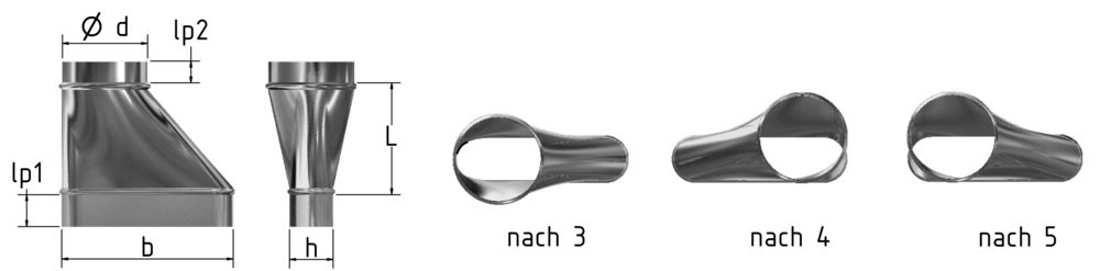 m+a Übergang UARO rund-oval, asym., links unten ge., BxH=660x250mm, auf Durchmesser=400mm, L=450mm